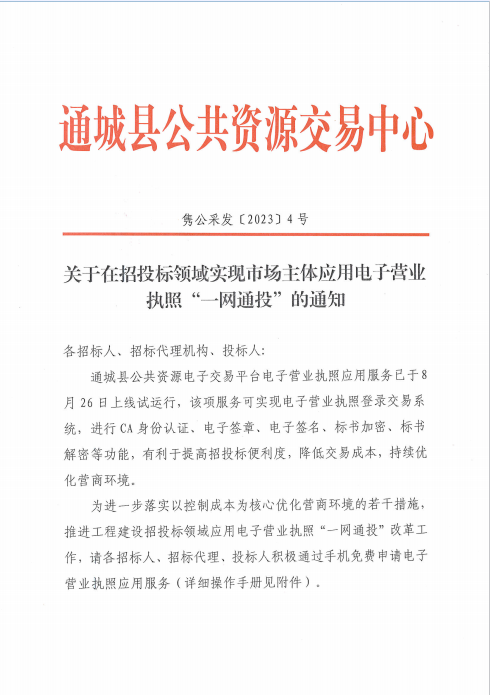 关于在招投标领域实现市场主体应用电子营业执照“一网通投”的通知